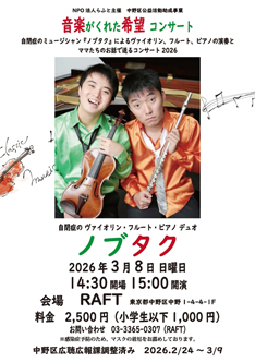 NPO法人らふと主催 中野区公益活動助成事業 『音楽がくれた希望コンサート』 自閉症のミュージシャン『ノブタク』によるヴァイオリン、 フルート、ピアノの演奏とママたちのお話で送るコンサート *日時 3月8日(日)14:30開場 15:00開演 *料金 2,500円(小学生以下1,000円) *予約/問合せ メール:yo@raftweb.info 電話:03-3365-0307 *予約に関して メールでご予約の際は、件名を「希望コンサート予約」とし、本文に 下記1~3を明記してください。 1.お名前 2.人数 3.ご連絡先(携帯電話or固定電話) ※2日たってもメールの返信が無い場合は、ご予約が完了していません。 お手数ですが再度メール、もしくはお電話にてご連絡ください。 ※感染症予防のため、マスクの着用をお薦めしております。 |